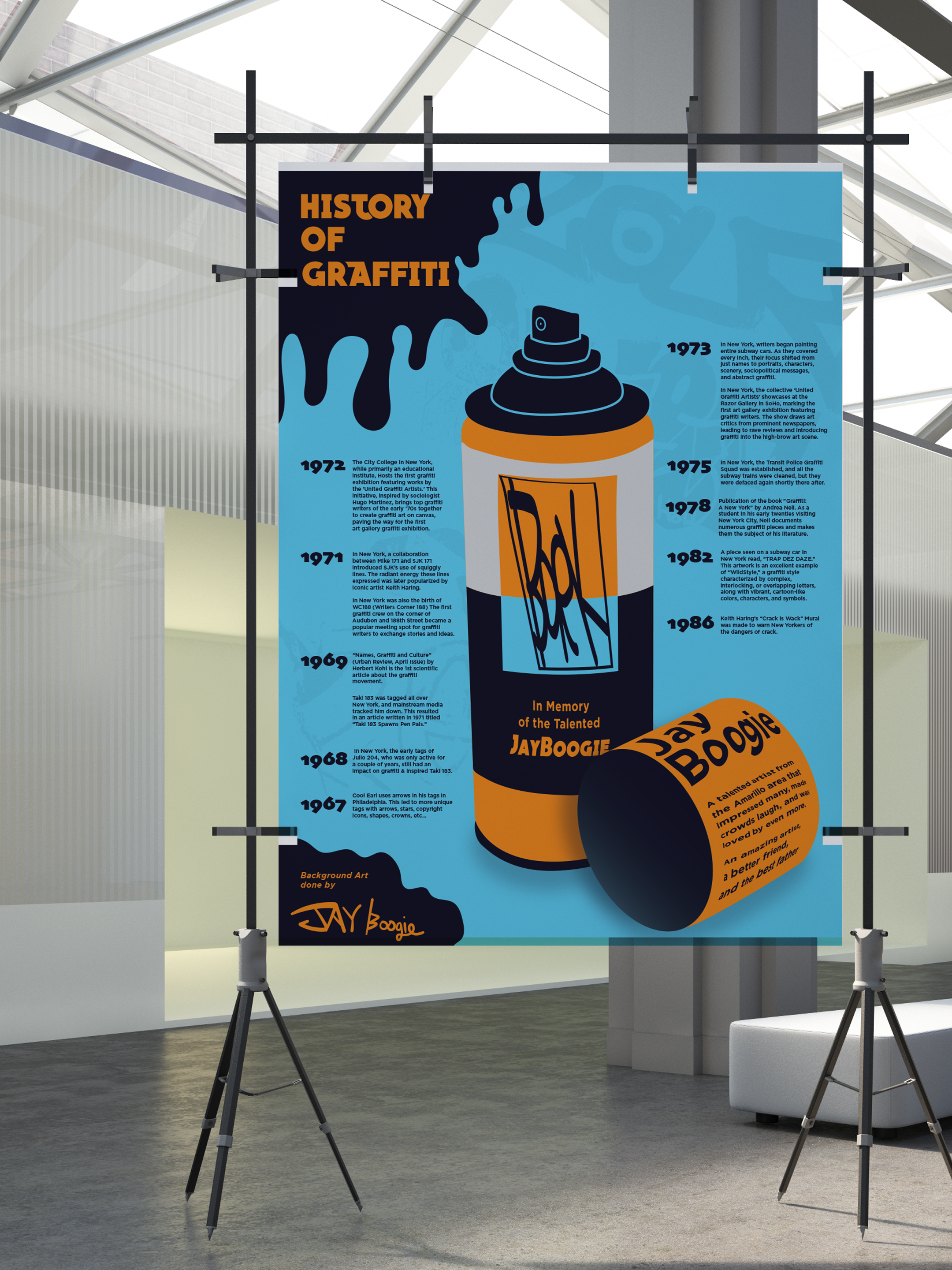 Summary: This timeline captures how graffiti has grown and changed over the years. I approached it like a visual storyhighlighting key artists, shifts in style, and moments that pushed the movement forward. Through bold type, color, and layered textures, the design reflects the raw energy and creativity that have always defined graffiti. It’s a piece that celebrates where the culture started and how it continues to inspire.